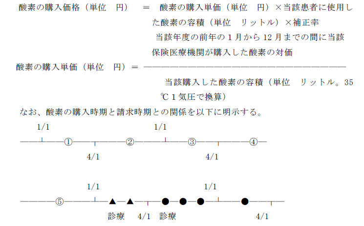 (5) (1)の規定にかかわらず、(1)に規定する区分ごとに次の算式により、保険医療機関ごとに算出される酸素の購入単価が(1)に規定する単価に満たない場合には、4月1日から3月31日までの1年間の診療については、この酸素の購入単価を用いて算出した酸素の購入価格によって請求するものとする。