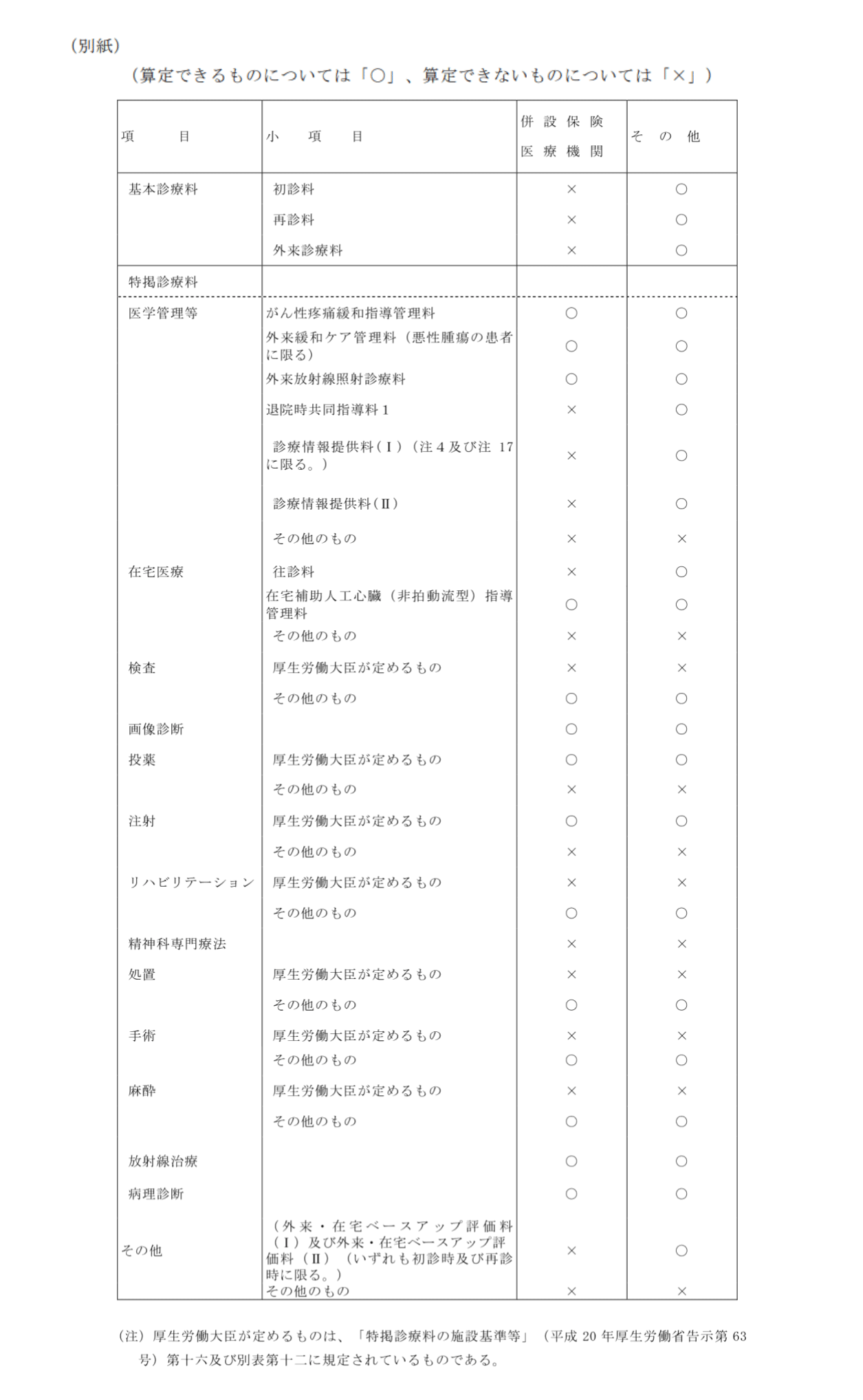 - 併設保険医療機関以外の保険医療機関に係る施設入所者共同指導料、施設入所者自己腹膜灌流薬剤料及び施設入所者材料料以外の診療料の算定は、第1章及び第2章の例による。ただし、第1章及び第2章に掲げる診療料のうち次に掲げるものについては算定しない。